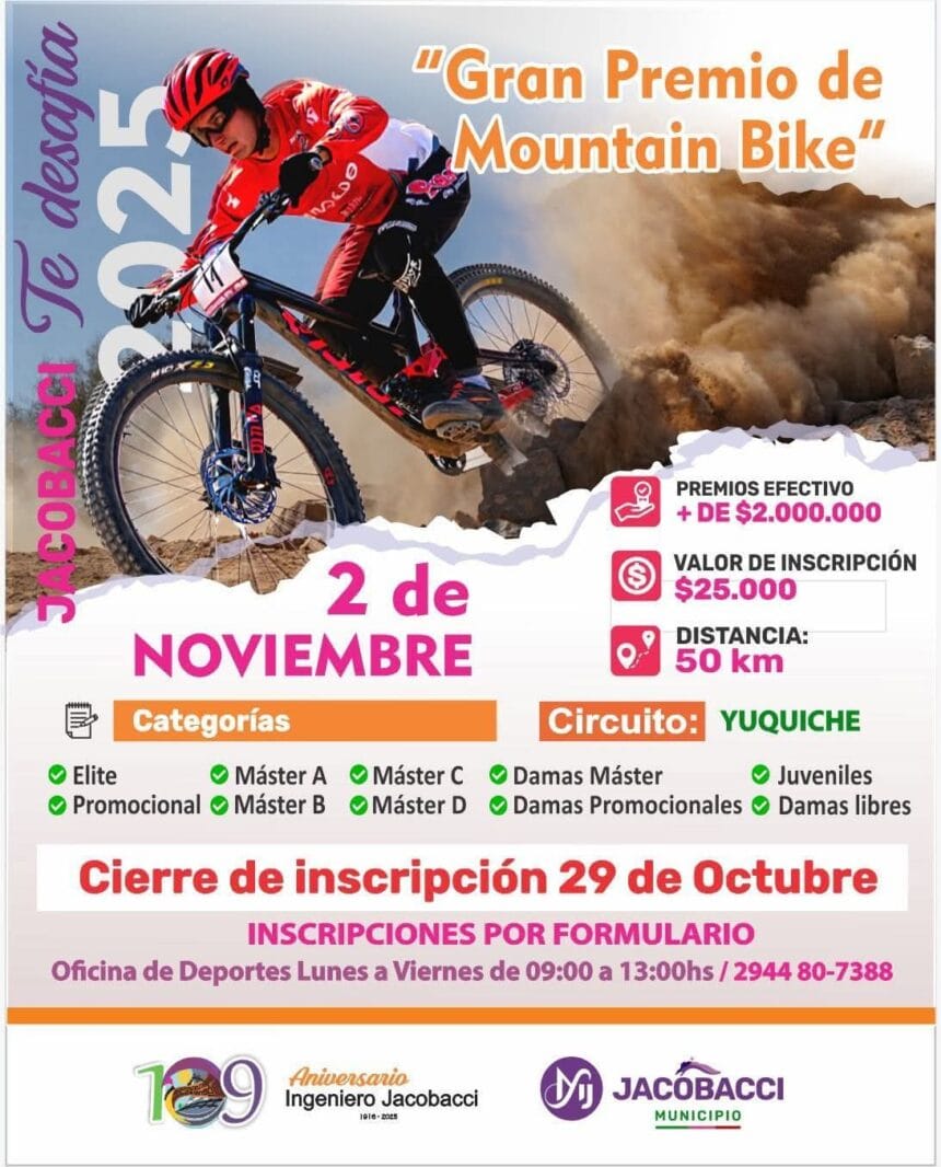Se acerca una nueva edición del Gran Premio de Mountain Bike, en el marco del 109° Aniversario de Ingeniero Jacobacci, y ya entramos en la última etapa de inscripciones. 📅…