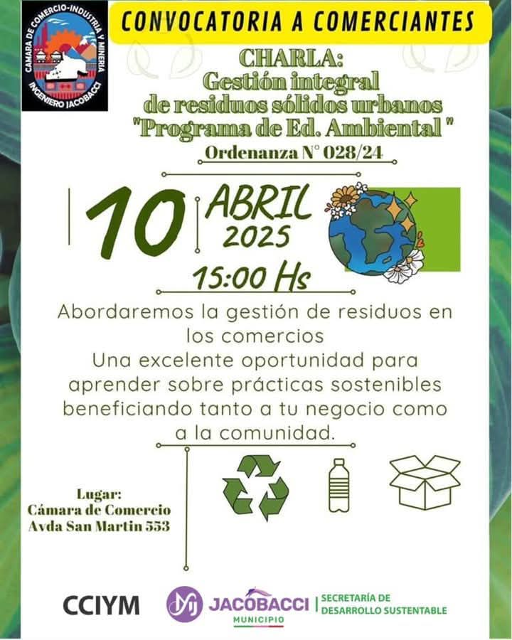 👉 El Municipio de Jacobacci, a través de la Secretaría de Desarrollo Sustentable, participará de una iniciativa de la Cámara de Comercio, Industria y Minería, que invita a comerciantes locales a participar de la “Charla de Gestión Integral de Residuos Sólidos Urbanos generados por la actividad comercial”.