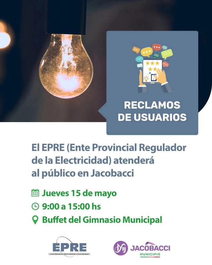 👉🏻 El Municipio Jacobacci informa que una delegación del Ente Provincial Regulador de la Electricidad (EPRE), atenderá los requerimientos de los usuarios del servicio eléctrico el próximo jueves 15 de mayo, de 09:00 a 15:00hs, en el buffet del Gimnasio Municipal.