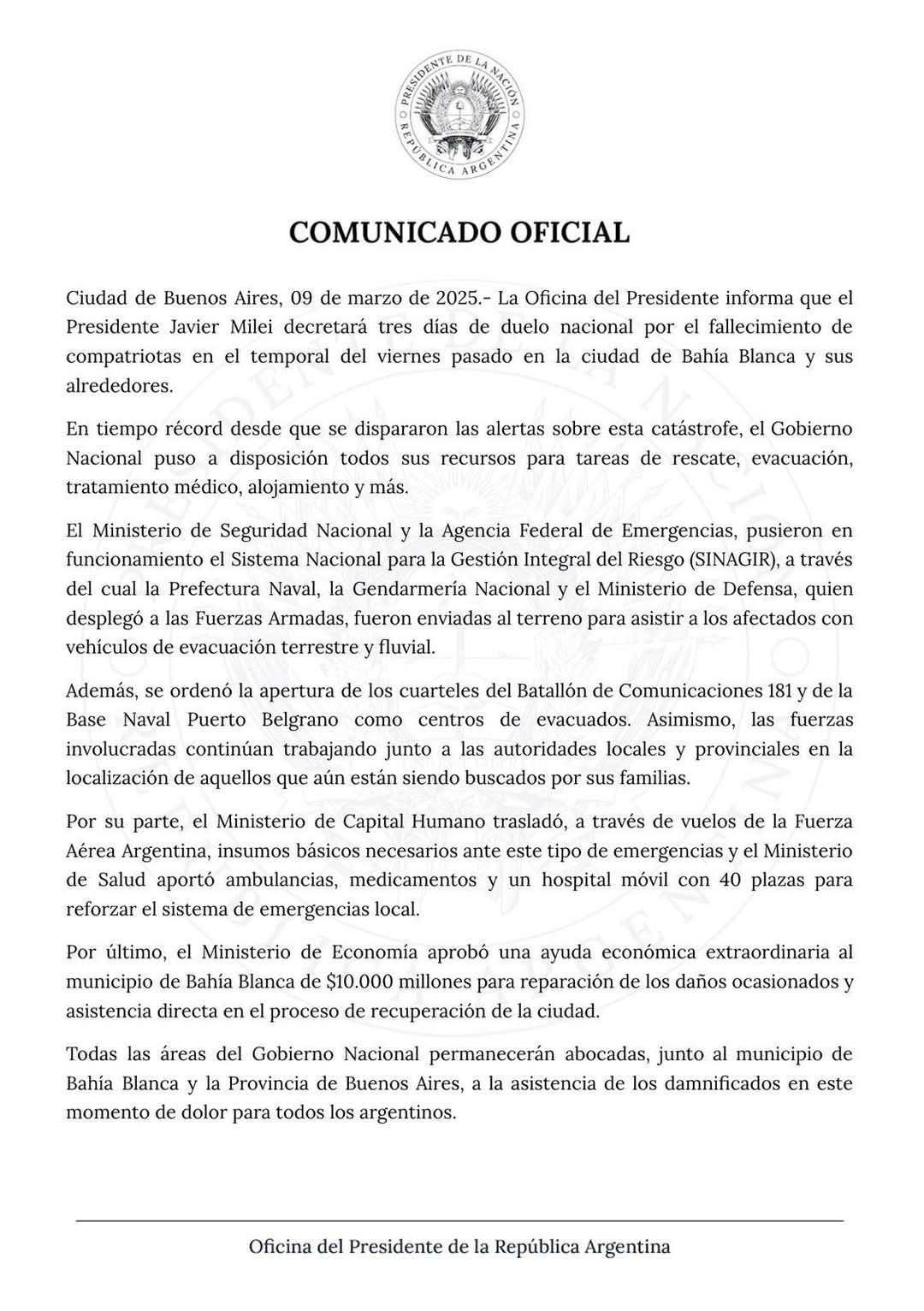 Nuestra GenteEl Gobierno decretó tres días de duelo nacional por Bahía Blanca Última actualización: 2025/03/11 at 8:10 PM Universo Noticias Compartir 0 de lectura Compartir El Gobierno decretó tres días de duelo nacional por Bahía Blanca. Universo Noticias marzo 11, 2025 marzo 11, 2025 Compartir este articulo Facebook LinkedIn Telegrama Correo electrónico Copiar link Imprimir Compartir Artículo Anterior Javier Montenegro: Un puntano que ganó el corazón de los Sierrenses Próximo Artículo MELLADO RECIBIÓ A SIBY, EL NUEVO CURA PARROCO DE JACOBACCI Deja un comentario Deja un comentario Deja un comentario Cancelar respuestaTu dirección de correo electrónico no será publicada. Los campos obligatorios están marcados con *Comentario *Nombre * Correo electrónico * Web Guardar mi nombre, correo electrónico y sitio web en este navegador para la próxima vez que haga un comentario. BuscarBuscar
