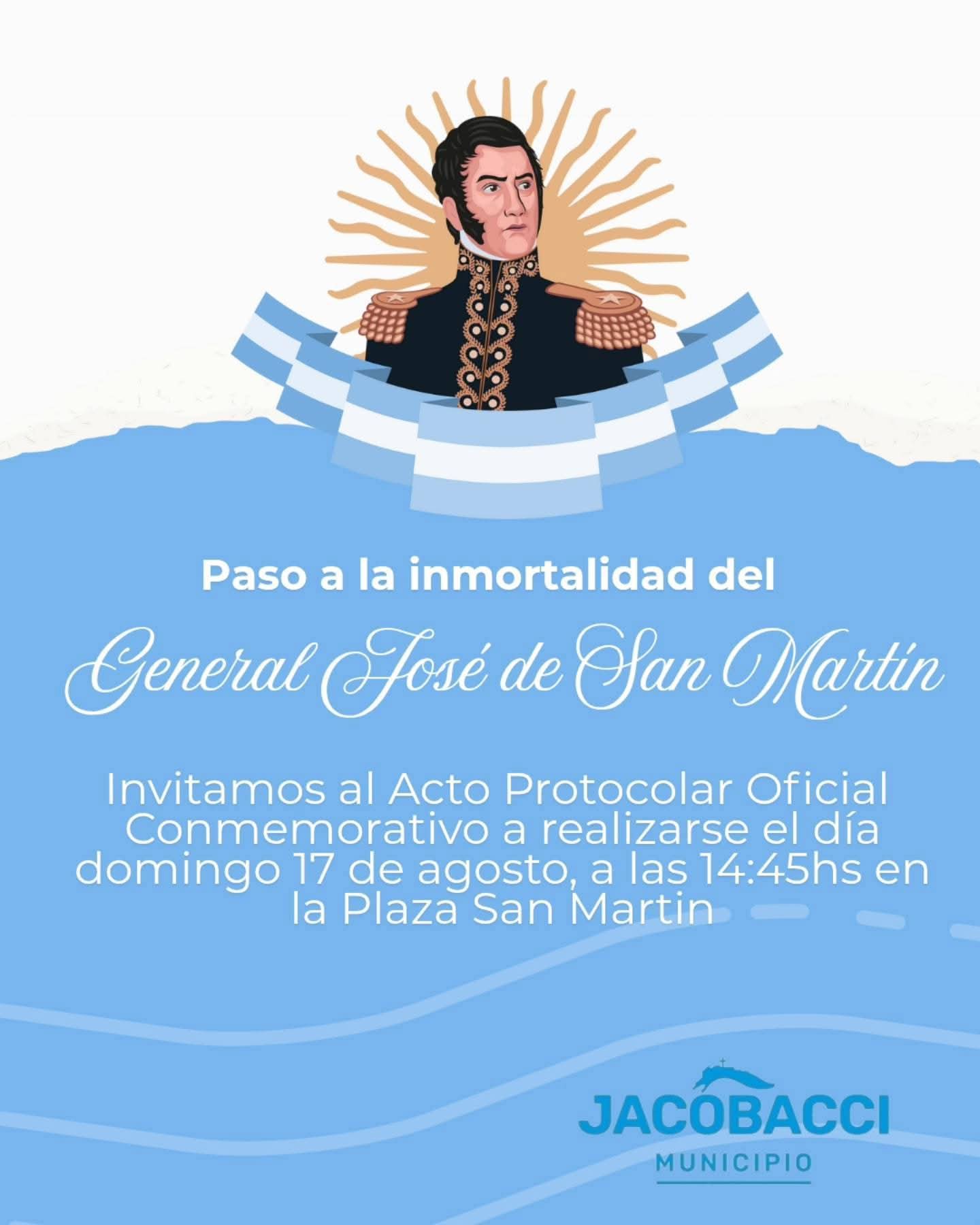 🇦🇷 El municipio Jacobacci invita a la comunidad a participar del Acto Protocolar Conmemorativo del 175° aniversario del Paso a la Inmortalidad de General José de San Martín, a realizarse el domingo 17 de agosto, 14:45hs en la plaza homónima.