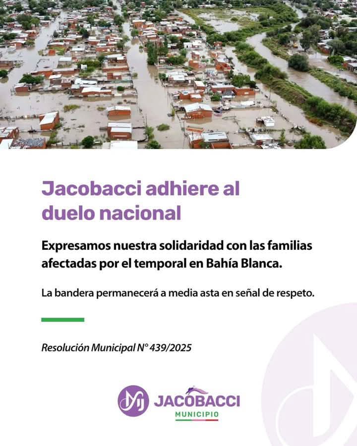 Mediante la Resolución 439/2025 el Municipio Jacobacci adhiere al Duelo Nacional por las víctimas del temporal en Bahía Blanca (DECTO-2025-178-APN-PTE/ DECTO-2025-171-E-GDERNE-RNE).