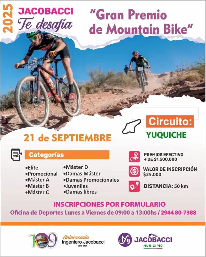 👉🏻El próximo 21 de septiembre, Ingeniero Jacobacci te invita al Gran Premio de Mountain Bike, en el desafiante circuito Yuquiche en el marco de los 109° aniversario.