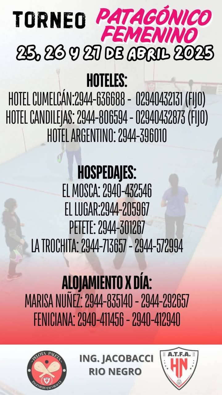 Gran torneo en Ingeniero Jacobacci los días 25, 26 y 27 de abril. Este torneo tiene como objetivo principal promover el desarrollo y la visibilidad de la pelota paleta femenina en la región, ofreciendo un espacio de competencia y camaradería para jugadoras de diversos clubes de la Patagonia.