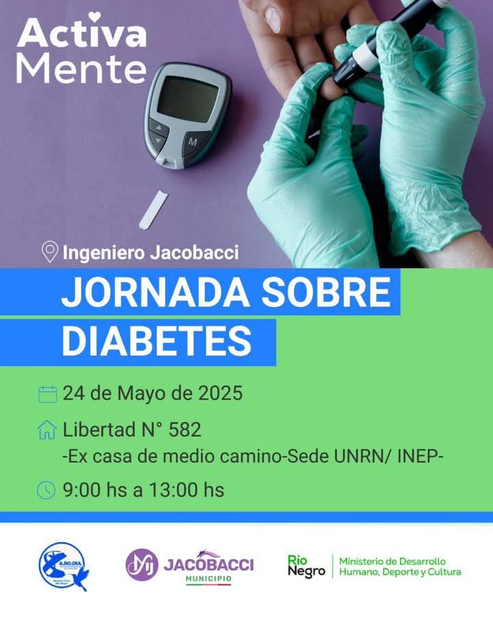 👉🏻 La jornada es una iniciativa promovida por el Ministerio de Desarrollo Humano de Rio Negro, el Municipio Jacobacci y la Asociación Roquense del Diabético, cuyos referentes y profesionales, junto al equipo técnico provincial serán disertantes.