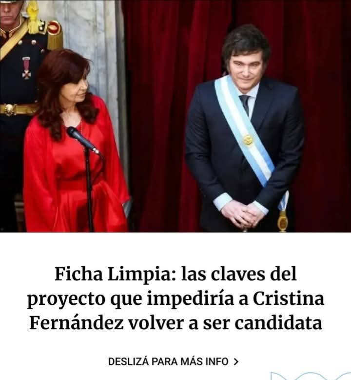 El presidente Javier Milei firmó anoche, antes de su viaje a Estados Unidos, la versión final del proyecto de ficha limpia que se incluirá en el período de sesiones extraordinarias que comienza este lunes. En caso de aprobarse, la norma impediría a la ex presidenta Cristina Fernández de Kirchner presentarse como candidata, ya que la iniciativa indica que aquellas personas que hayan sido condenadas en primera y segunda instancia por delitos de corrupción en la función pública y en perjuicio de la Administración no podrán hacerlo.