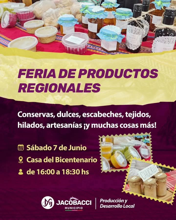 👉🏻 La Secretaria de Desarrollo Sustentable, mediante la coordinación de Producción y Desarrollo Local invita a la comunidad a participar de una nueva Feria de productos regionales, que se realizará el sábado 7 de junio en la Casa del Bicentenario de 16:00 a 18:30 hs.