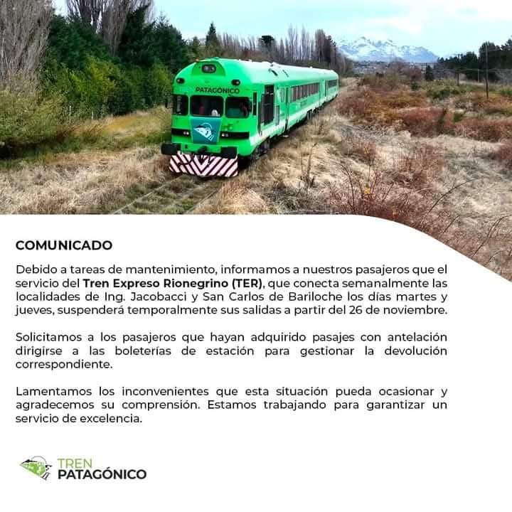 Debido a tareas de mantenimiento, informamos a nuestros pasajeros que el servicio del Tren Expreso Rionegrino (TER), que conecta semanalmente las localidades de Ing. Jacobacci y San Carlos de Bariloche los días martes y jueves, suspenderá temporalmente sus salidas a partir del 26 de noviembre.