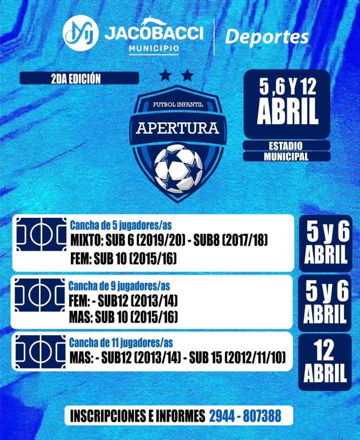 La coordinación municipal de Deportes, informa las fechas de cierre de inscripción para los quipos locales y regionales que quieran ser parte del Torneo Apertura de Fútbol Infantil categorías Sub 6 – 8 – 10 – 12 que inivia 5 y 6 de abril, y sub 12 15 masculino que arranca el 12 de abril en el Estadio Municipal de Jacobacci.