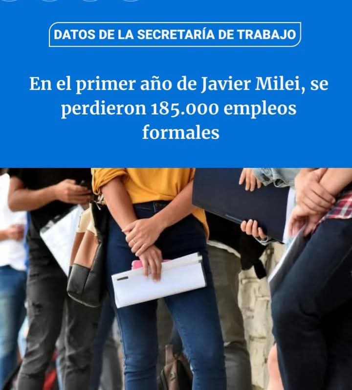 Según datos difundidos por la Secretaría de Trabajo, que depende del Ministerio de Capital Humano de la ministra Sandra Pettovello, entre diciembre de 2023 y noviembre de 2024, es decir, en el primer año de gestión de Javier Milei como presidente, se perdieron 185.000 empleos formales y el empleo privado asalariado registró una caída de 119.000 personas, al descender de 6.385.000 a 6.266.000 trabajadores.